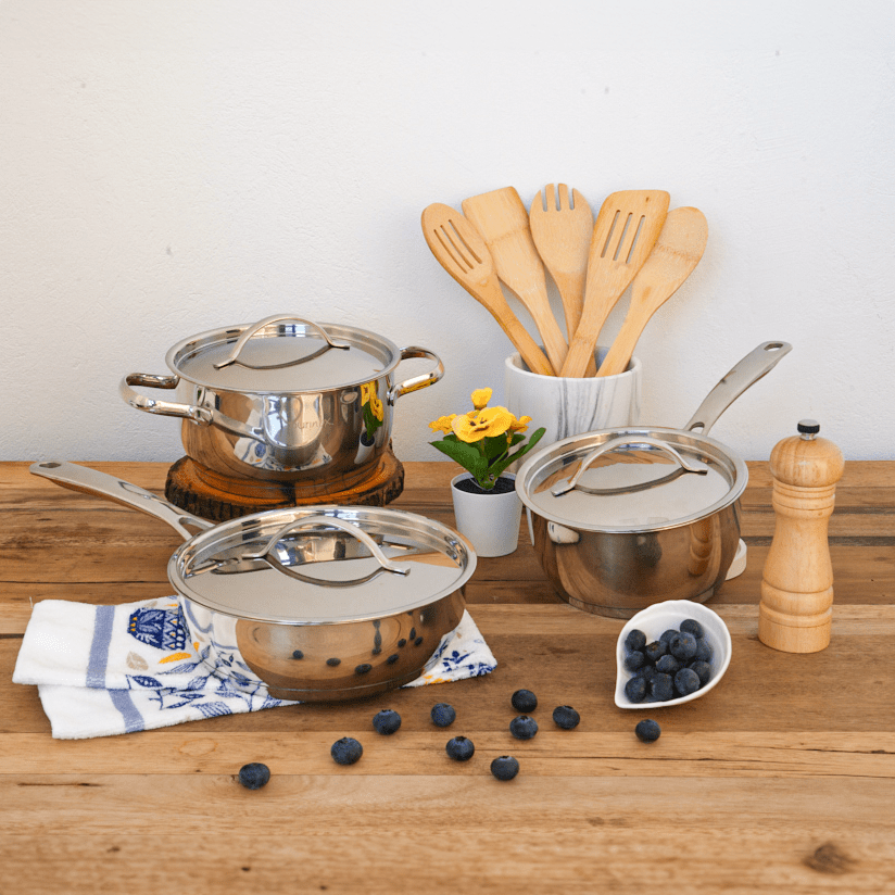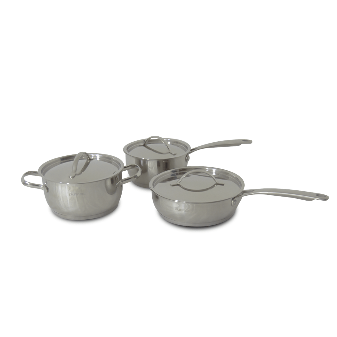 Set de cocina de seis piezas elaborada en acero quirúrgico T-304. Contiene tres recipientes de diferentes tamaños con sus respectivas tapas. Asas aislantes de calor y disco difusor de temperatura.