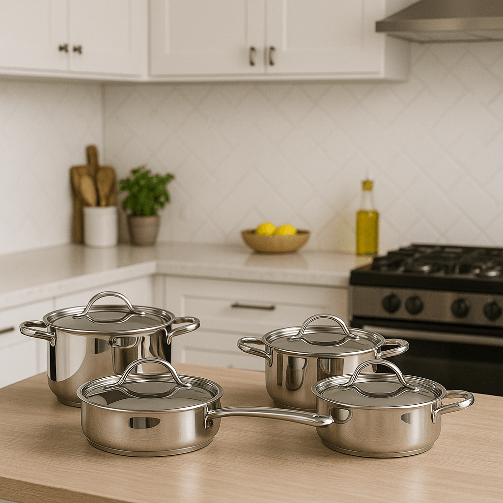 Set de cocina de ocho piezas con tres capas de acero quirúrgico T-304. Contiene cuatro recipientes de diferentes tamaños con sus respectivas tapas. Asas aislantes de calor, disco difusor de temperatura y unidad de medida interna.