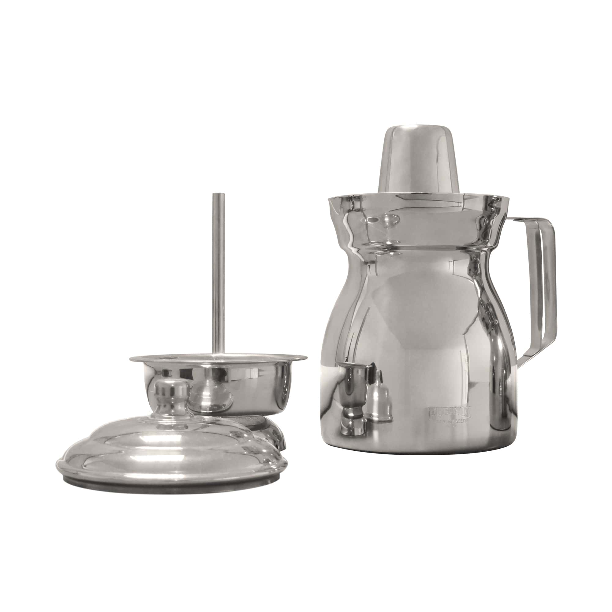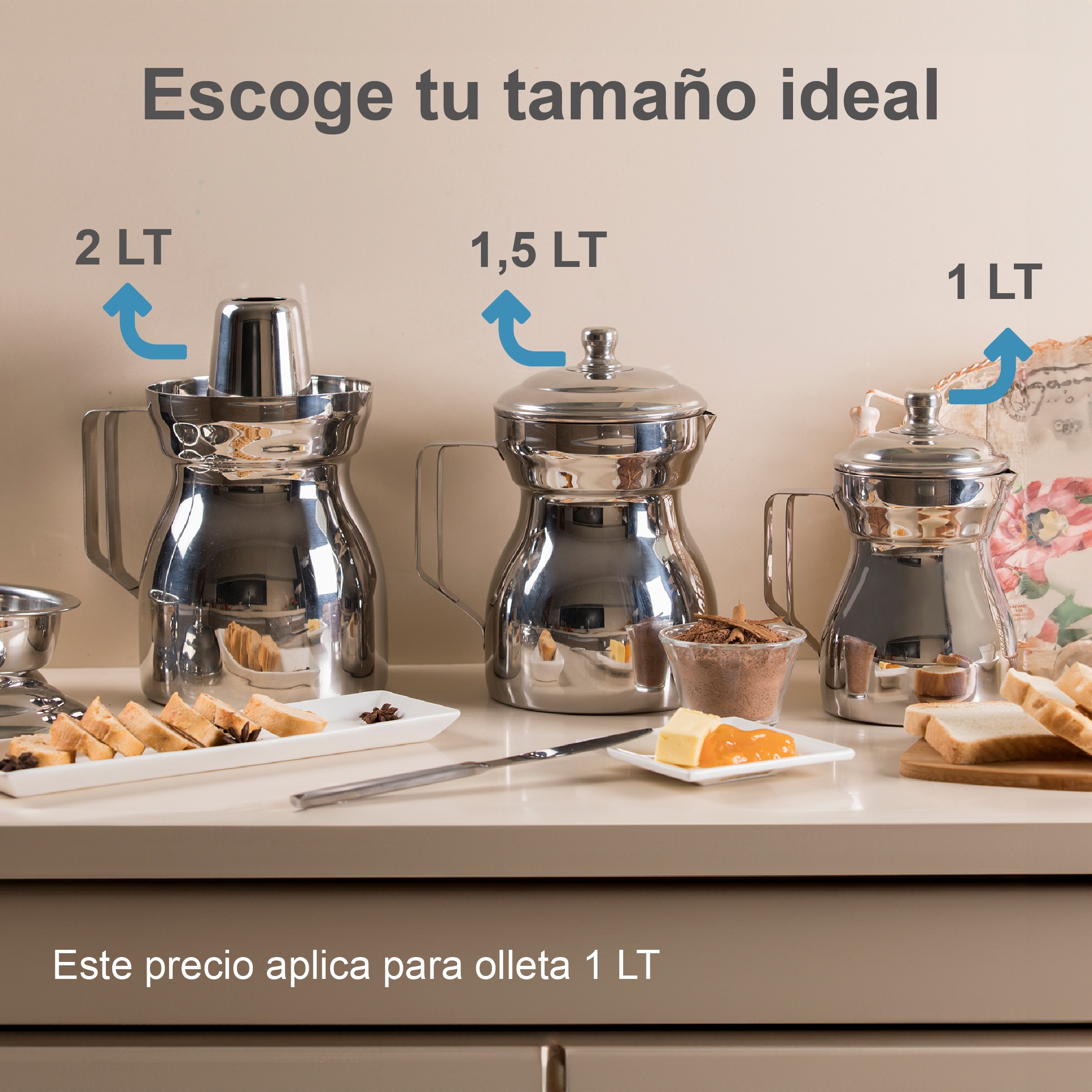 Olleta elaborada en acero quirúrgico T-304. Con capacidad de un litro. Manija aislante de calor y disco difusor de temperatura. Incluye elementos de cafetera y un cono antiderrame para leche o chocolate.