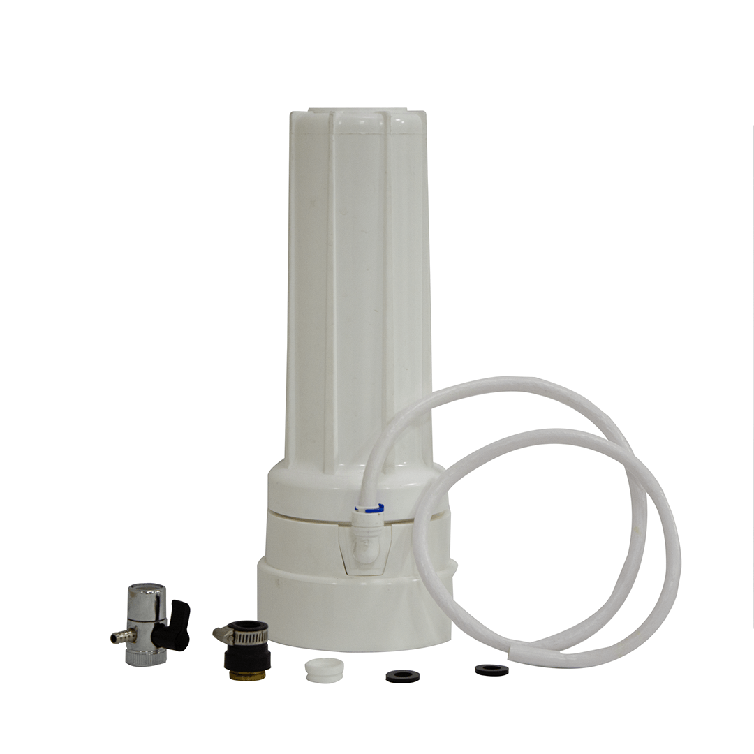 Sistema de filtración sencillo en ABS marca Ozonobriza. Salida de cuello de cisne. Instalado directamente en la llave del lavaplatos.