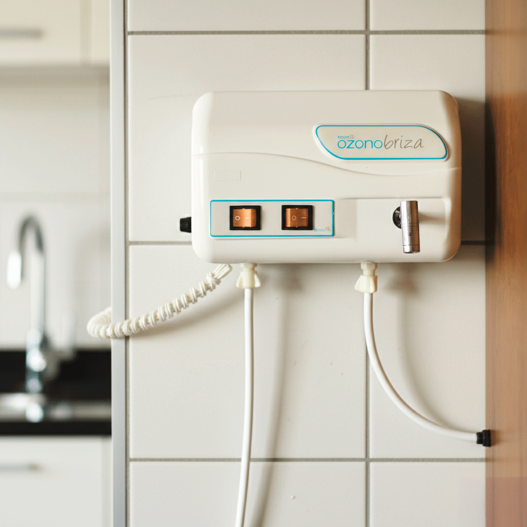 Purificador de agua en ABS marca Ozonobriza, con filtro de carbón activado certificado en NFS. Indicador de encendido/apagado y switch para ajustar la concentración de ozono