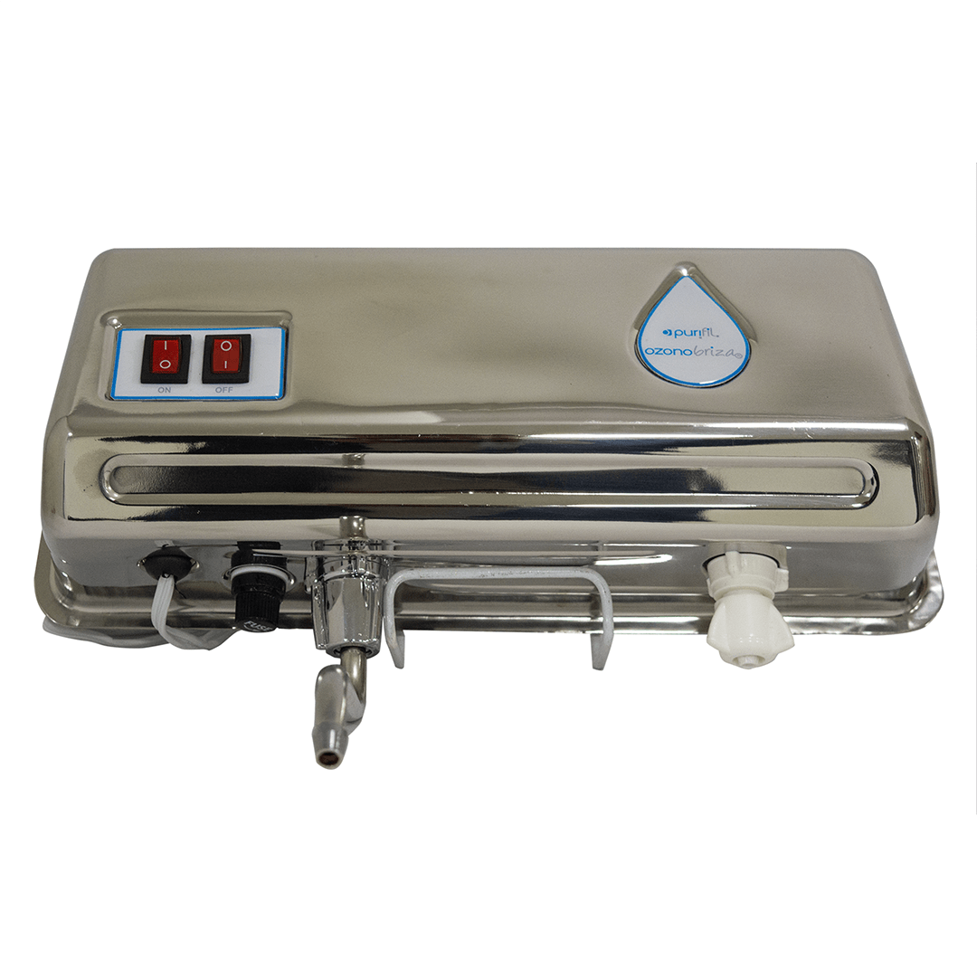 Purificador en acero quirúrgico marca Ozonobriza. Con filtro de carbón activado en bloque certificado en NSF. Indicador de encendido/apagado y switch para ajustar la concentración de ozono.