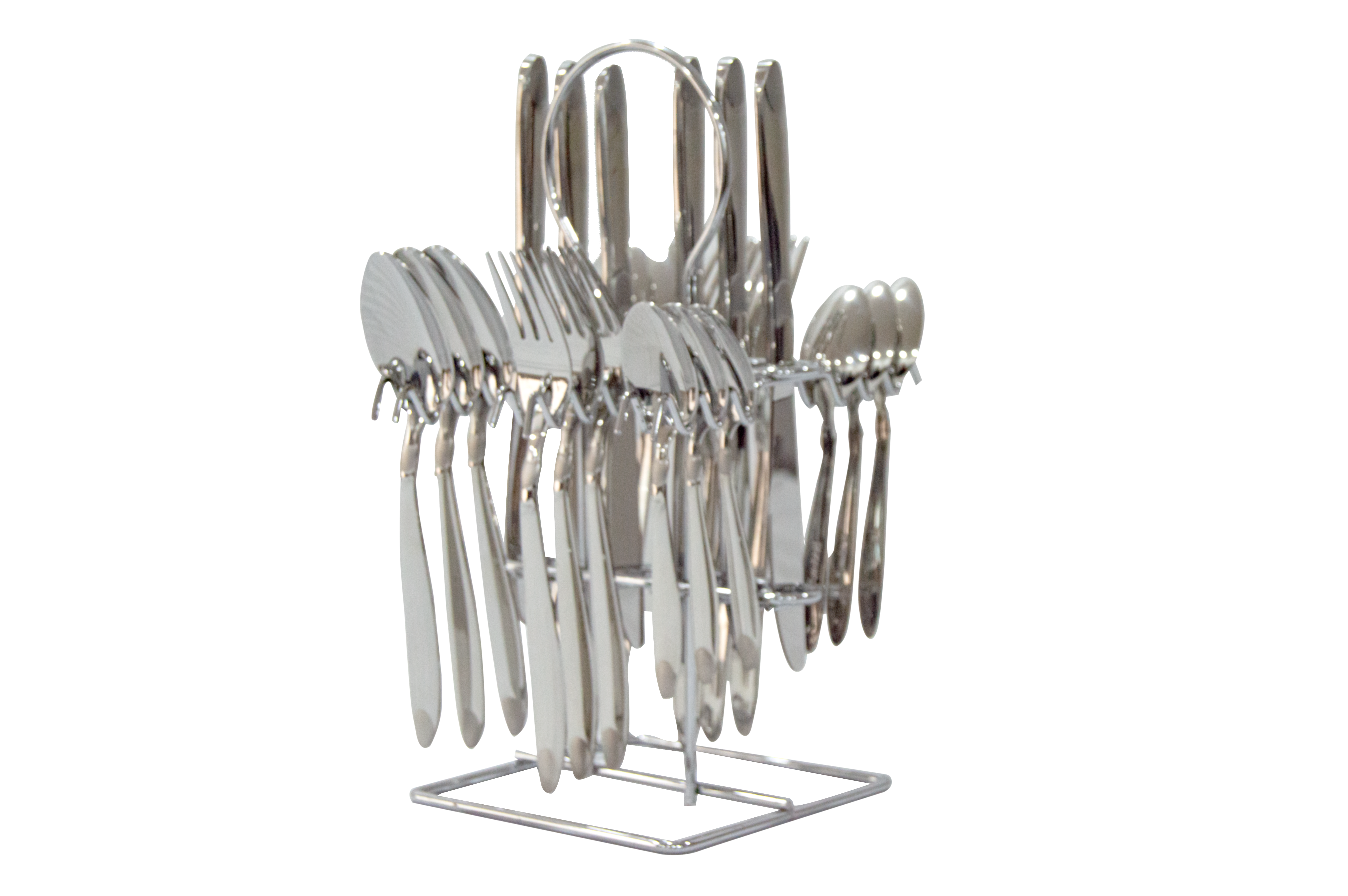 Set de cubiertos elaborados en acero quirúrgico T-304. Contiene cucharas, cuchillos y tenedores de diferentes tamaños y soporte para llevarlos a la mesa.