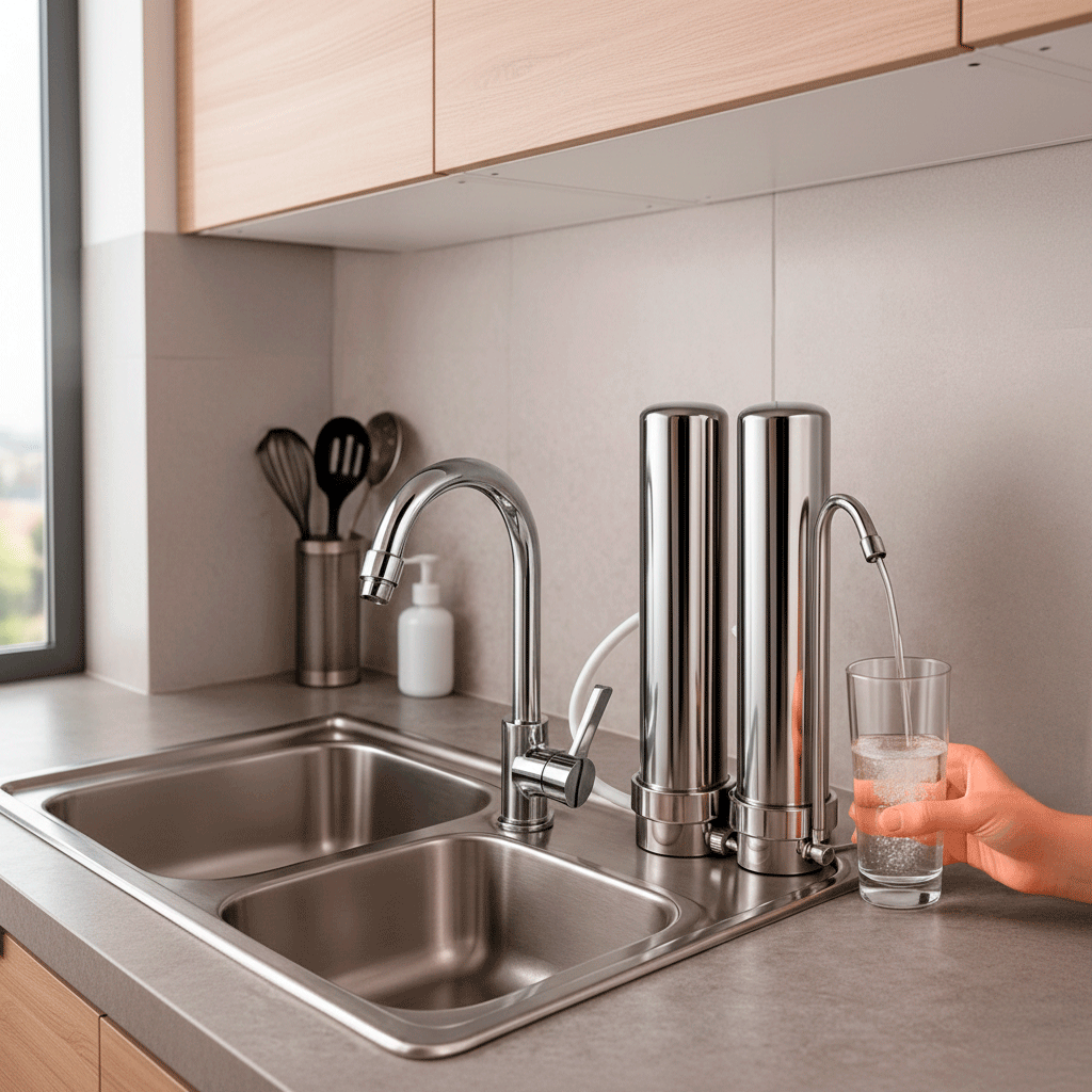 Sistema de ultrafiltración con estructura en acero quirúrgico. Con dos etapas de filtración: membrana UF y carbón en bloque activado.